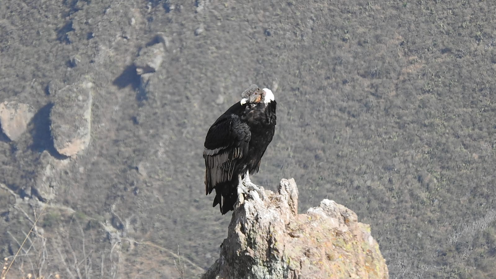 Doch plötzlich, unten im Canon, ist der erste Kondor kurz zu sehen, bevor er wieder hinter den Felswänden verschwindet. Noch ein bisschen Geduld! In der Ferne entdecken wir ihn wieder und langsam zieht er seine Kreise nach oben. Ein zweiter kommt dazu, jedoch sind sie ein ziemliches Stück links von uns. Wir wechseln unseren Standort und sind jetzt links vom offiziellen Aussichtspunkt. Paßt! Hier haben wir den idealen Standort zur Beobachtung. Und da sind sie auch schon, die Könige der Lüfte. Jetzt haben sich noch andere zu ihnen gesellt. Majestätisch führen sie ihre akrobatischen Flugmanöver vor.
