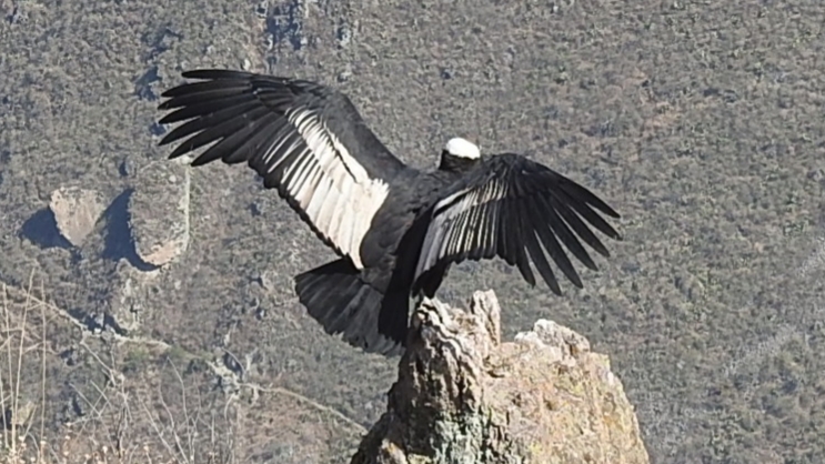 Mit einer Flügelspannweite von bis zu 3,20 Metern ist er einer der größten Vögel der Welt. Im Flug hat er von unten gesehen ein schwarzes Federkleid. Wenn er unter uns im Canon fliegt sehen wir die wunderschöne schwarzweiße Zeichnung des Gefieders von oben. Ein Stück vor uns landet gerade einer auf einem Felsen.