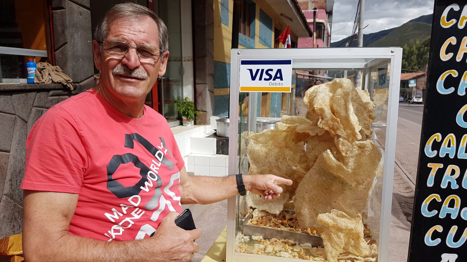 Wir sind jetzt am Stadtrand von Cusco und vor fast jedem Restaurant ist ein Glaskasten am Fußweg mit etwas großem, gelblichen, das irgendwie undefinierbar ist. Wir halten an, fragen nach und probieren das Ding mal. Es ist knusprig frittiertes Schweinefett oder so ähnlich. Kann man essen, muss man aber nicht.