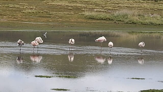 Irgendwann kommen wir an einem kleinen See vorbei und ich entdecke wieder Flamingos. Diesmal sind sie ganz nah, die langbeinigen Federtiere. Super!