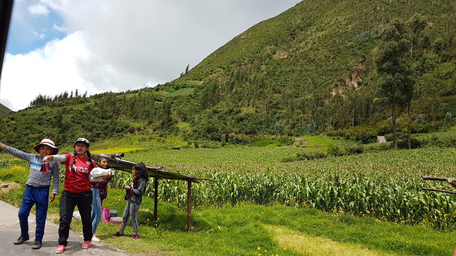 So nun zurück zur Landschaft! Wir nähern uns Cusco und sind noch immer auf 3600 m. Doch jetzt erheben sich vor uns hohe grün bewachsene Berge. Am Straßenrand stehen Laubbäume und der angebaute Mais ist auch schon über einen Meter hoch. Der Verkehr nimmt jetzt drastisch zu und die Fahrbahn wird grottenschlecht.