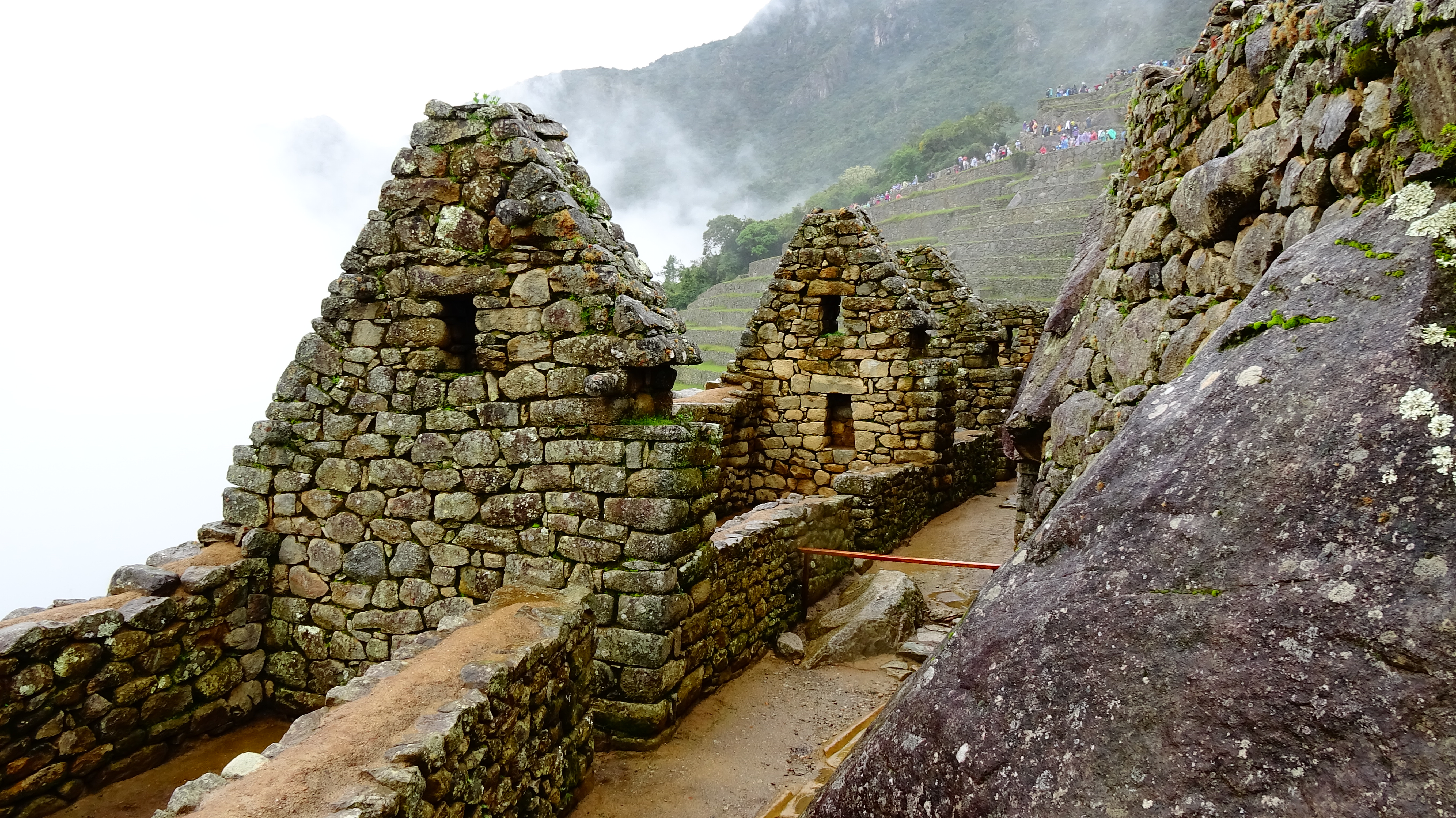 Wir gehen weiter hinunter in die vergessene Stadt während die Wolken ihr Spiel mit uns treiben. Auch die umgebenden Berge sind eigenartig und stehen fast wie einzeln da. Wie ein im Wind wehender, weißer Schleier legen sich die Wolken dazwischen und geben dem Ganzen einen geheimnisvollen, mystischen Charakter. Die Touristen verteilen sich etwas in der Stadt und wir können in Ruhe die einzelnen Häuser und Stätten besichtigen.