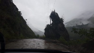 Und los geht's! Wir fahren zum Berg. Dort steht immer noch der Mann mit dem Stoppschild, aber er deutet, dass wir warten sollen. Kurz darauf dreht er das Schild und wir dürfen los. Die verantwortlichen Leute stehen immer noch rum und diskutieren, während zwei Bauarbeiter den Hang auf weitere Abgänge beobachten. Wir tasten uns vorsichtig über den steinigen, rutschigen, löchrigen Lehmboden, da deutet uns einer der Bauarbeiter der den Hang beobachtet, dass wir schnell weiterfahren sollen. Kommt da etwa schon wieder was von oben? Keine Ahnung! Augen zu oder besser Augen auf und durch! Juhu geschafft! Jetzt haben wir zwar noch den anderen gefährlichen Teil der Strecke vor uns, aber das ist mir auf einmal egal. Hauptsache weg hier! Ein paar hundert Meter weiter sitzt schon wieder ein Bauarbeiter und beobachtet den Hang, aber er winkt uns durch. Irgendwann kommen Häuser in Sicht und wir haben es endgültig geschafft und sind raus aus dem Tal.