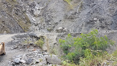 Oh nein! Der Hang ist abgerutscht und der Weg unterspült. Von oben kommen laufend Erdrutsche und riesige Felsbrocken nach. Drei Polizisten sind da und sperren die Zufahrt ab. Ein großes Räumfahrzeug steht auch bereit, kann aber nicht eingesetzt werden, da es zu gefährlich ist. Ein Mann mit weißem Helm schaut kritisch zum Hang hinüber, ich glaube er ist für den "Straßenbau" verantwortlich. Und schon wieder geht eine Mure ab. Wieviel ist von der Straße überhaupt noch da?