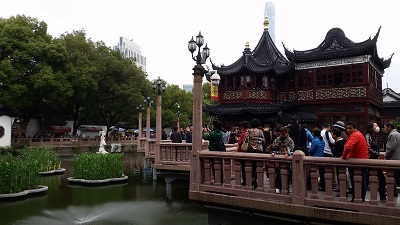 Aufgelockert wird dieses Gewirr der Gassen durch einen kleinen Teich mit Springbrunnen, unzähligen Koi-Fischen und blühenden Seerosen. Das dahinter befindliche Hu Xin Ting-Teehaus, das älteste der Stadt, lädt zur Teeverkostung und zur Demonstration der Teezubereitung ein. Doch um dies zu Erreichen müssen wir eine Zickzackbrücke mit 7 Biegungen überqueren.