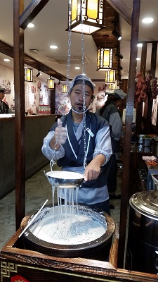 Schmeckt eigentlich ganz gut, doch die Nudeln sind nahezu nicht kleinzukriegen. Während der Anfang der Nudel schon im Bauch ist, hängt das Ende noch oben raus! Ganz faszinierend finden wir eine Krabbensuppe, die in einer Art Teigknödel serviert wird und mit einem Strohhalm daraus getrunken wird. Die kalte geleeartige Suppenmasse wird dazu fachmännisch in einem geschmeidigen Teig eingewickelt und anschließend gedämpft. Der dann flüssige Inhalt kann so leicht mit einem Strohhalm genossen werden. Die Leute stehen dafür geduldig in einer schier endlosen Schlange an.