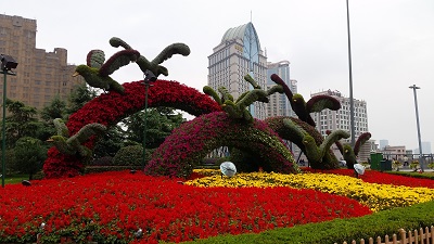 Wir müssen nur ein kleines Stück weiter gehen, um zum "Bund" zu kommen. Dabei handelt es sich um eine elegante, mit Blumen gesäumte Promenade entlang des Huangpu Flusses.