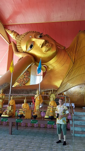 Die Anlage selbst ist eigentlich nichts besonderes, doch zu unserem Erstaunen liegt hier ein 49 m langer, goldener Buddha, der erst 2006 errichtet wurde. Er ähnelt sehr dem liegenden Buddha im Wat Pho in Bangkok. Doch hier behindern die tragenden Säulen des Daches nicht die Sicht und er ist in seiner ganzen Grösse zu bewundern. Fabelhaft!