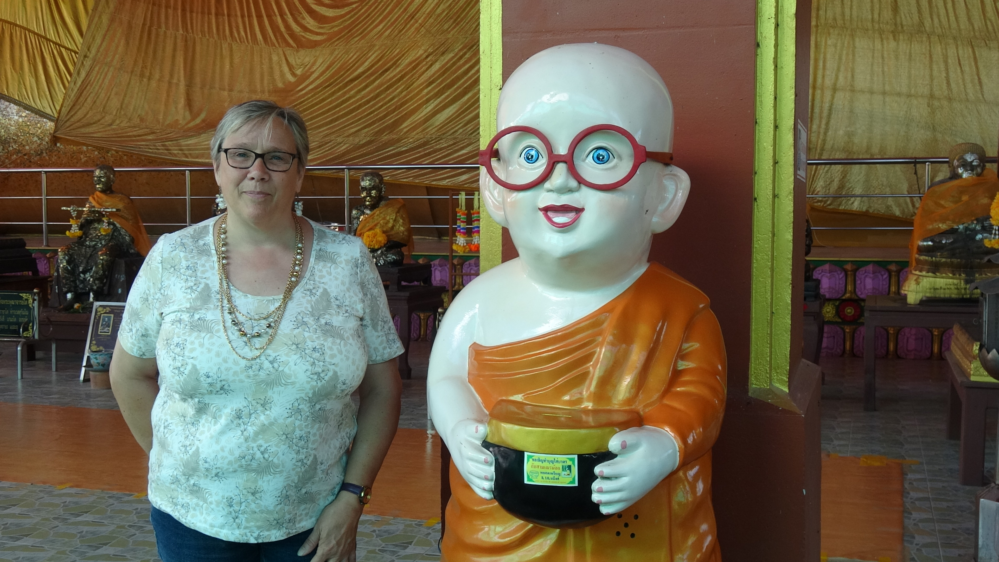 An einer Säule steht ein kitschiges Buddhamännchen, könnte aus Plastik sein, mit einem Geldeinwurfschlitz. Die anderen thailändischen Tempelbesucher fordern uns auf, dort ein paar Baht einzuwerfen. Und siehe da, das "Männchen" beginnt ein Segensgebet zu sprechen und ich verbeuge mich brav.
