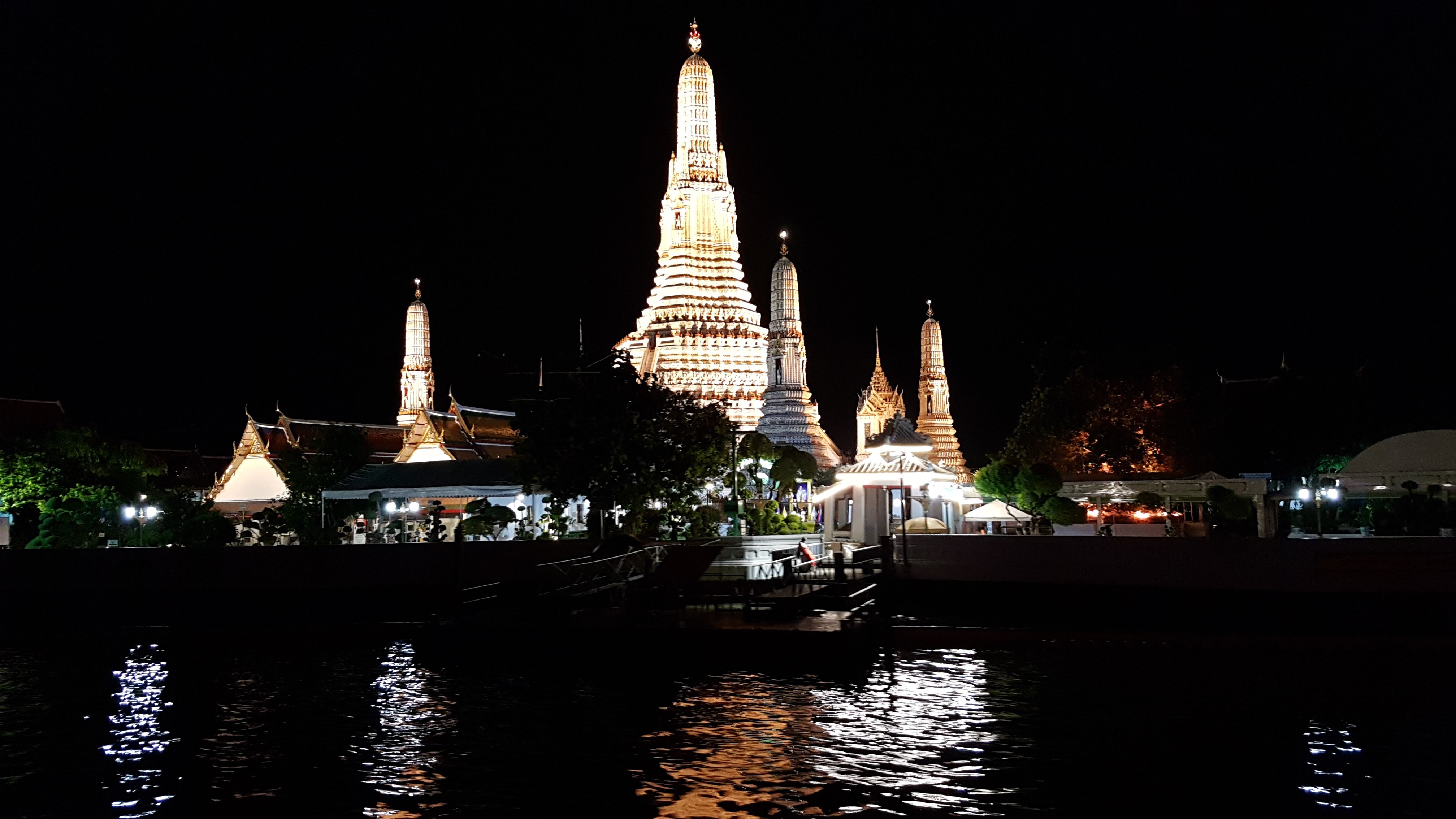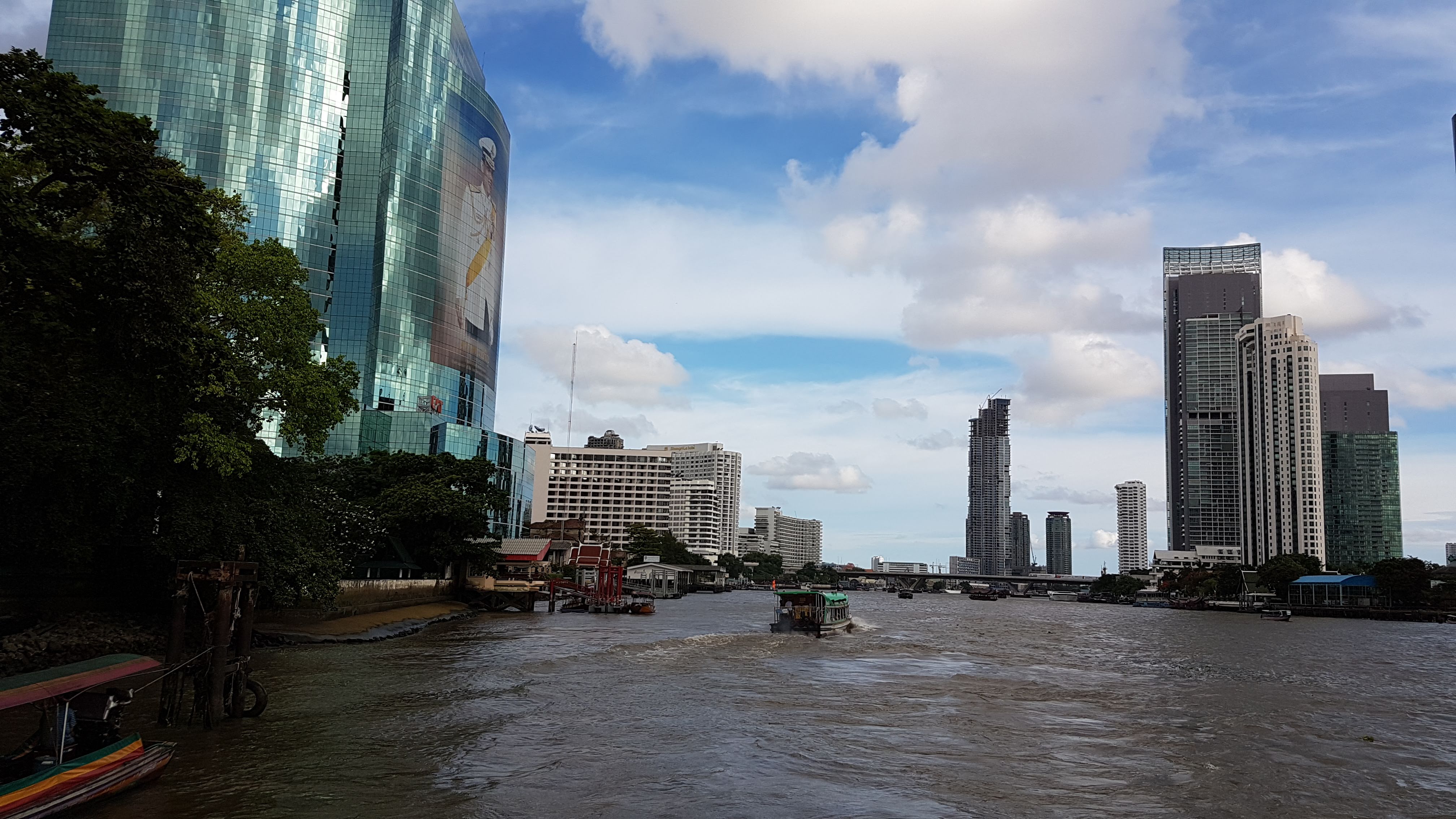 Wir beziehen unser direkt am Chao Phraya liegendes Hoter und haben von Balkon aus einen herrlichen Blick auf die "Haupttempel" Bangkoks, den Wat Phra Kaeo mit Königspalast, den Wat Pho und den Wat Arun. Fantastisch! Auch das rege Treiben auf dem Fluss weckt unsere Aufmerksamkeit. Hier verkehren die verschiedensten Schiffe und Fähren. Das war auch ein Grund, weshalb ich das Hotel direkt am Fluss gebucht habe. Nach 100m sind wir am Bootsanleger und kommen schnell zu den wichtigsten Sehenswürdigkeiten, ohne Strassenverkehr, ohne Stau und ohne Stress.
