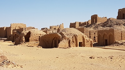 Many Christians fled to the desert from persecution or were exiled here. 263 grave chapels and a church were built here from adobe. The grave chapels are partly provided with a dome made of adobe bricks and built either square or rectangular. There was a time when the bodies were embalmed and buried in a hole inside the graves. In some chapels we also find very well preserved frescoes with colorful pictures from the Bible.